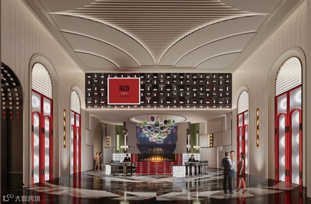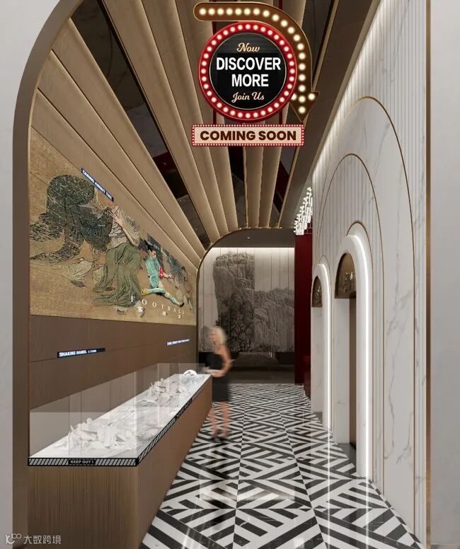大堂电梯厅与互动区正面形态采用西安城墙门轮廓,抽取出镜像关系。电梯厅用未来考古的概念雕塑将酒店的新潮文化与运动融合西安当地特色从一种考古学观点来捕捉未来性。墙壁挂画则是古今中外的一场足球比赛,用“football”的谐音翻译成“富得宝”。候梯驻足时能惊奇发现如博物馆般挖掘出潮流的运动轨迹,激发出对酒店更强的探索欲望,沉思间已经已经调入丽芮设置的巨大艺术漩涡中。
