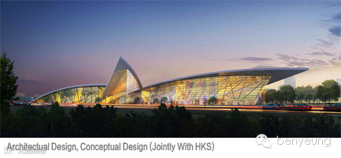 本案的设计灵感来源于展翅翱翔的飞鸟,外形简洁流畅,糅合了鸟类飞翔时的灵巧轻逸与现代建筑的抽象性、多变性,展现了会展中心独特的魅力。整个项目由展区、办公区、商业区及住宅区四部分组成。屋顶采用大面积倾斜的玻璃玻,仿佛振翅欲飞的双翼,不但扩大空间感、增加视觉深度,还增强了室内光感,兼具实用性与艺术性。建筑物内部以结构严谨的三角柱架构系统支撑,使整座建筑更为轻盈灵动。