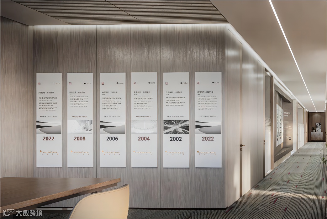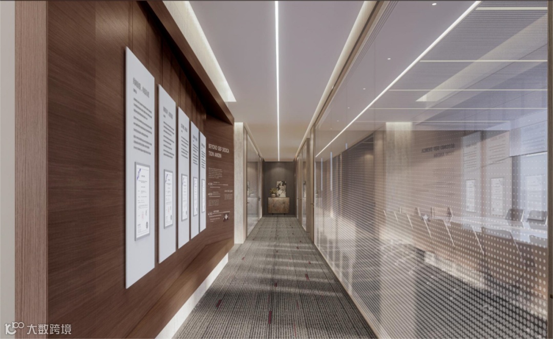 顺着设计动线,来到企业走廊荣誉墙,展示力合资本的品牌文化及荣誉。光顺着会议室透明玻璃进入空间场景,光影流动,整个空间透亮而有呼吸感。荣誉墙以深色木纹面板作为背景,与前厅形成色彩呼应。走廊尽头底部沿用会议室深红色漆饰面板作为背景映衬,软装上采用抽象东方艺术画及绿植盆景作为点缀,避免空间的沉闷,增添空间场景的活力,碰撞出多几分东方的雅致、高级,同时又保留了金融企业的沉稳格调。
