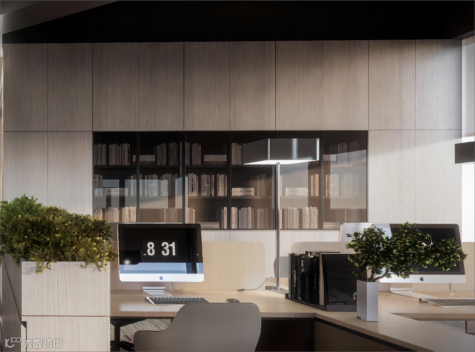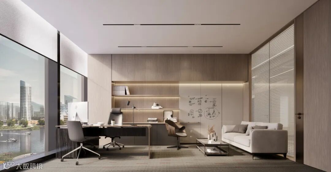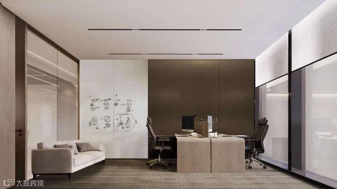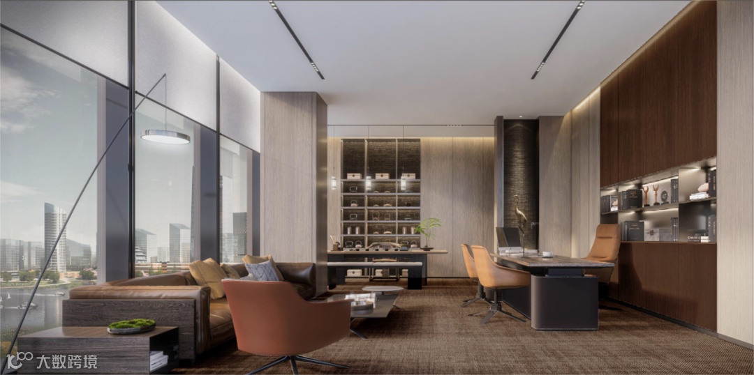 总裁办公室强调专属性和私密感,设计延续整体设计风格,在色调上沿用深棕色及古铜色,于轻奢质感细节中刻画总裁的高级品位与身份。总裁办公室在满足日常办公的空间功能之余,还承载着社交场所的功能,因此总裁办公室的设计在功能上需要满足更多功能场景可能性,或办公或商务社交或休憩冥想。透明幕墙将自然光引入室内,将室内视野打开,通透开阔,使得室内外的界限变得模糊,空间氛围舒适平和。