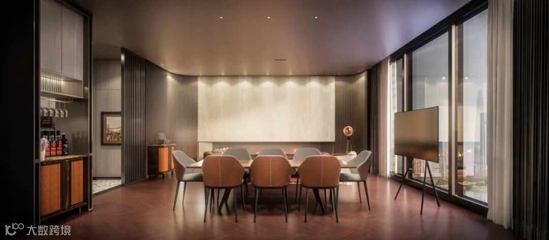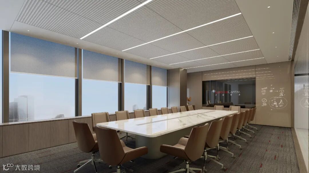 大会议室的设计开阔明亮,视野通透,保持场所交流的张力,在空间设计上强调专业严谨高效的会议室环境,空间中设计展示柜,以深红色漆饰面板为背景,展示力合资本荣誉奖项,在视觉感官上跳跃活泼,减少空间的沉闷,增加空间的舒适度,让思路更加自由顺畅。