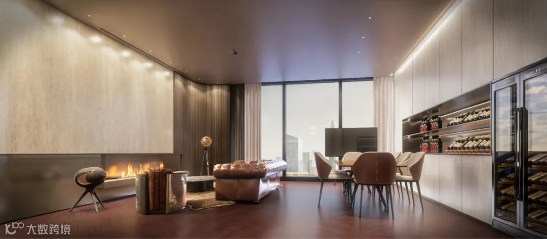 接待室的设计在兼顾私密性的基础上,更要创造一种亲密而自由的洽谈氛围。空间设计了收纳柜,满足收纳各种美酒的功能,以酒待客,格调雅致,相谈甚欢,优享时光。在材质上,墙面选用古铜色磨砂不锈钢及天然洞石增强空间质感与高级感,椅子选配橙色,增强活泼自由的视觉观感,为空间带来更多活力与朝气,同时配置壁炉,在空间上营造温暖舒适的空间氛围,稀释商务会谈严肃紧张的氛围,拉近与宾客的距离感,建立有温度的情感链接。
