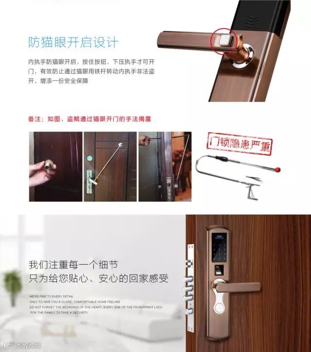 亚萨合莱佳卫智能锁和久邦智能锁,一直致力于研发出更人性化,更安全、更好用的智能锁,针对现在小偷盗窃频繁这一现象,设计人员专门添加了防止小偷通过猫眼开启的功能!