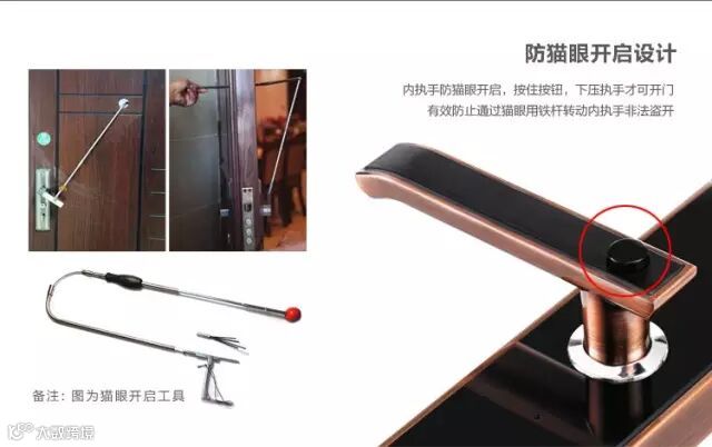 在锁的后把手,添加了一个安全按钮,想要开启门锁,需要按下按钮,才可打开房门!就算小偷下了猫眼,也无济于事!O(∩_∩)O哈哈~