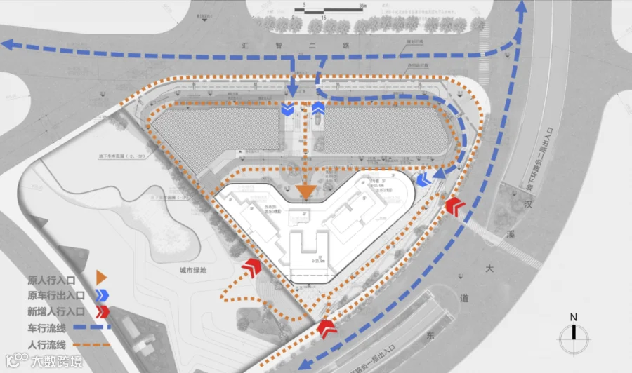 项目在交通布局方面,华新·青创旺地项目位于汇智二路与汉溪大道交汇处,交通便利。车行出入口设在汇智二路,人行出入口设在交汇处。同时,利用城市绿地开辟了一条通向商场的专用入口。规划过程中严格遵守相关规定,确保安全性和合规性。