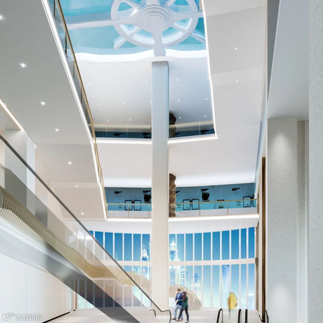 博物馆展陈藏品地下一层为现代科技风格,二层以上为传统文化风格,室内设计与之呼应在一二层的扶梯处设计海洋时空环,由此感受不同时期历史文化的过渡。