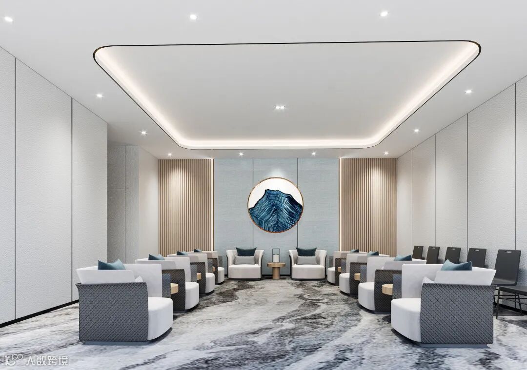 贵宾接待室设计以简约雅致、文化艺术为主,大块面的设计手法注重细节表达,在地毯和艺术陈设上融入海洋元素延续整体主题。