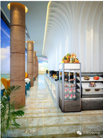 特色餐厅位于B2层,面向北面的海景。天花层层叠叠的造型与靠窗边的承重墙连成一气,将室外景观以风云涌动之姿引入室内。酒吧与入口散座区域的不锈钢圆柱以旋风为造型,象征海面龙卷风卷起的巨大水柱。天花的叶片装饰以这些圆柱为中心向外飘散,营造了无拘无束、自由自在的感觉。