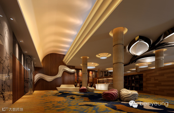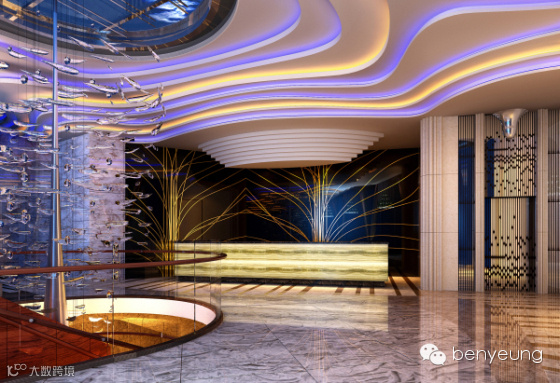 酒店首层设计以”潜水”为主题, 因此进入南沙咀酒店的大堂不是“走”而是“游”进去的。故室内设计以“水影”玻璃天幕为起点,在纯净蔚蓝的海平面下,呈现一个七彩斑斓的海底世界。支撑这个水影天面的柱也就成了“珊瑚柱”。服务台、电梯间以及堂吧墙面则是“水底的岩体”—采用了水晶白云石、珍珠贝马赛克面。优雅的蓝光从镶嵌面的夹缝流泻出。服务台的背景是一片舞动的水草。两边的休息沙发设计成球状的珊瑚花、水底岩石,点缀了大堂的每个角落。梯的设计灵感来源于海螺—从上往下逐层缩小。天面的银鱼吊饰从首层向下延伸到B2层,形成了一条导向路线。