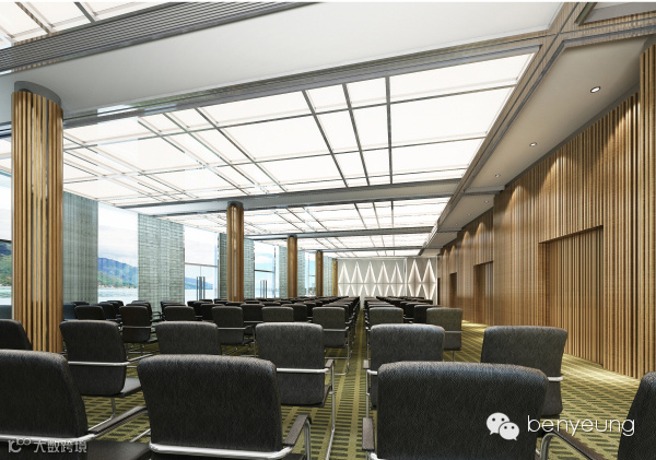 会议中心大堂拥有5间多功能活动隔间,能同时容纳106人。富有现代感的条码型木饰条夹玻璃半透明间隔,象征水岸的红树林,成为点缀大堂的一件艺术品。天花板的设计灵感用来源于林间树影雾化的投影光斑。
