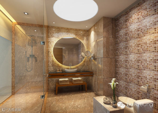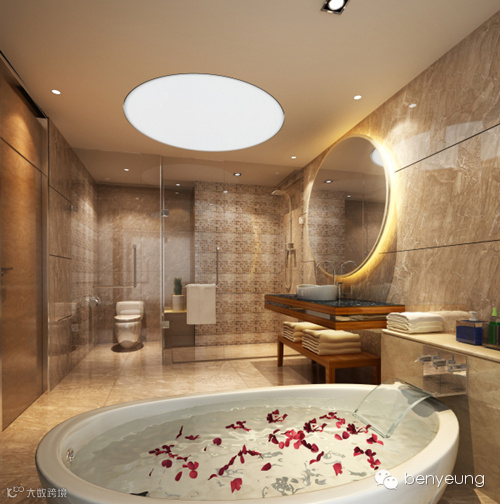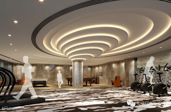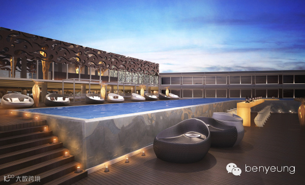 大堂通道连接池畔吧以及更衣沐浴间。以大堂的圆柱为中心,地面和天花如涟漪般向外扩散。层层的“涟漪”令池畔吧的休闲区域与大堂融为一体。更衣沐浴间的外墙用不平整的镜面元素装饰,将空间全景映照成曼妙的水影。池畔吧以透光玉石为造型,从泳池的外围平台延伸至泳池内部,加强了泳池与池畔的互动。沙滩椅设计成海螺的形状,旁边的落地灯则以海底发光植物的形态出现,让人仿佛置身与海洋之中。