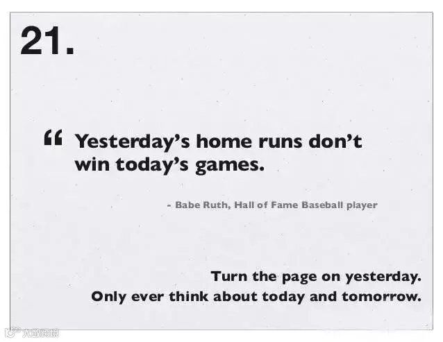 21、把昨天翻过去,只考虑今天和明天。昨天的全垒打赢不了今天的比赛。—好汉不提当年勇。