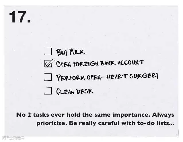 17、从来没有两个任务会有相同的优先级,总会有个更重要,仔细考虑待办事情列表。