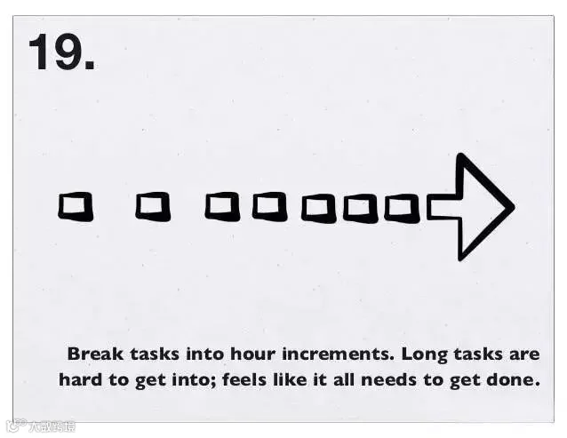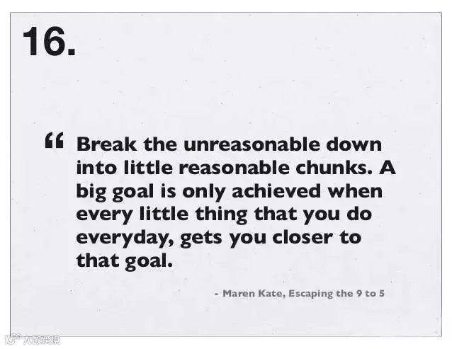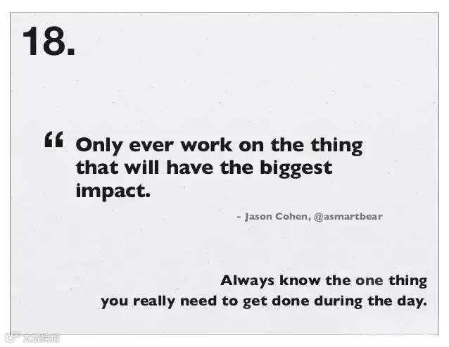 18、必须清楚白天必须完成的那件事,是什么。“Only ever work on the thing that will have the biggest impact” 只去做那件有着最大影响的事情。—— Jason Cohen