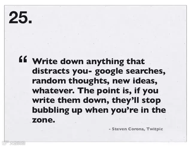 25、进入高效状态后,记下任何分散你注意力的东西比如Google搜索词、灵光乍现的想法、新点子等等。如果你把它们记下来,它就不会再蹦来蹦去了。