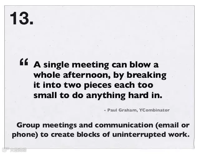 13、把会议和沟通 (邮件或电话) 结合,创造不间断工作时间:一个小会,也会毁了一个下午,因为它会把下午撕成两个较小的时间段,以至于啥也干不成。PS:当看到一个程序员冥思苦想时,不要过去打扰,甚至一句问候都是多余的。
