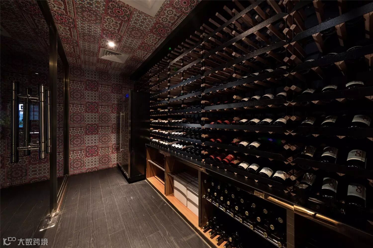 酒窖以落地玻璃与餐厅相隔,这样既可让酒窖实现内部的温度控制,也可让酒窖成为向客人展示的橱窗,增添空间的通透感。而酒窖内部以特色花砖作为装饰,也显示了精致的巴黎风格。