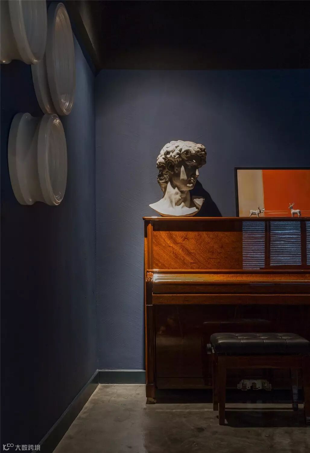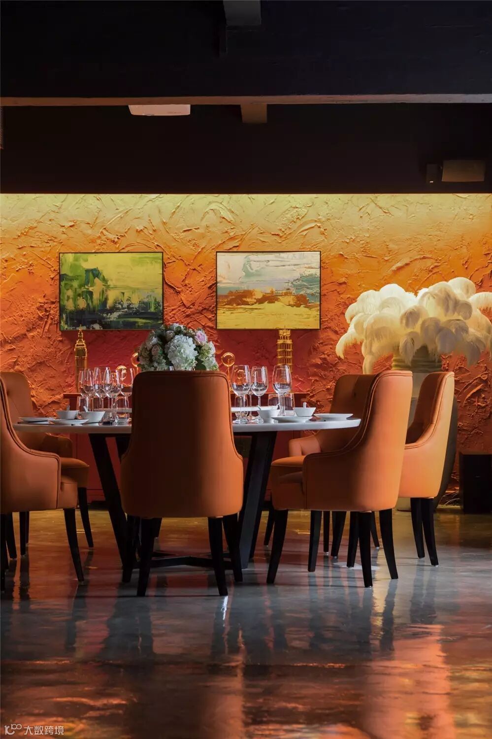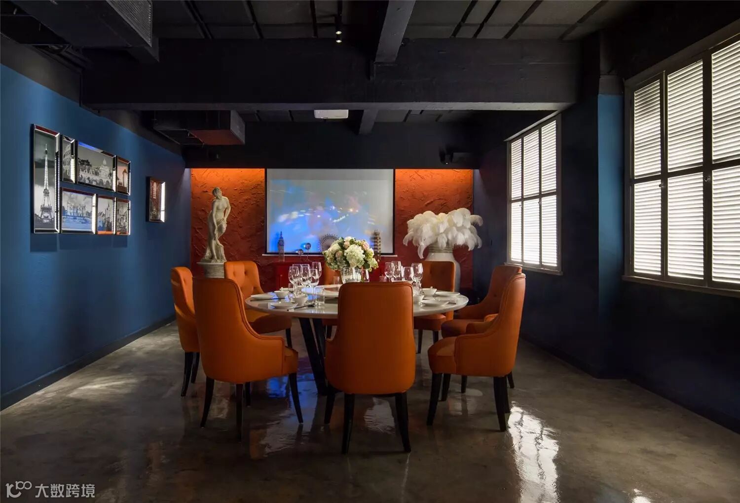 VIP室以可开可合的活动门与餐厅相隔,实现更多的空间可能性。VIP室以跳跃的爱马仕橙作为投影幕背景墙及皮质餐椅的色调,与会所整体基调的绅士蓝形成对比,令空间层次感更为丰富。