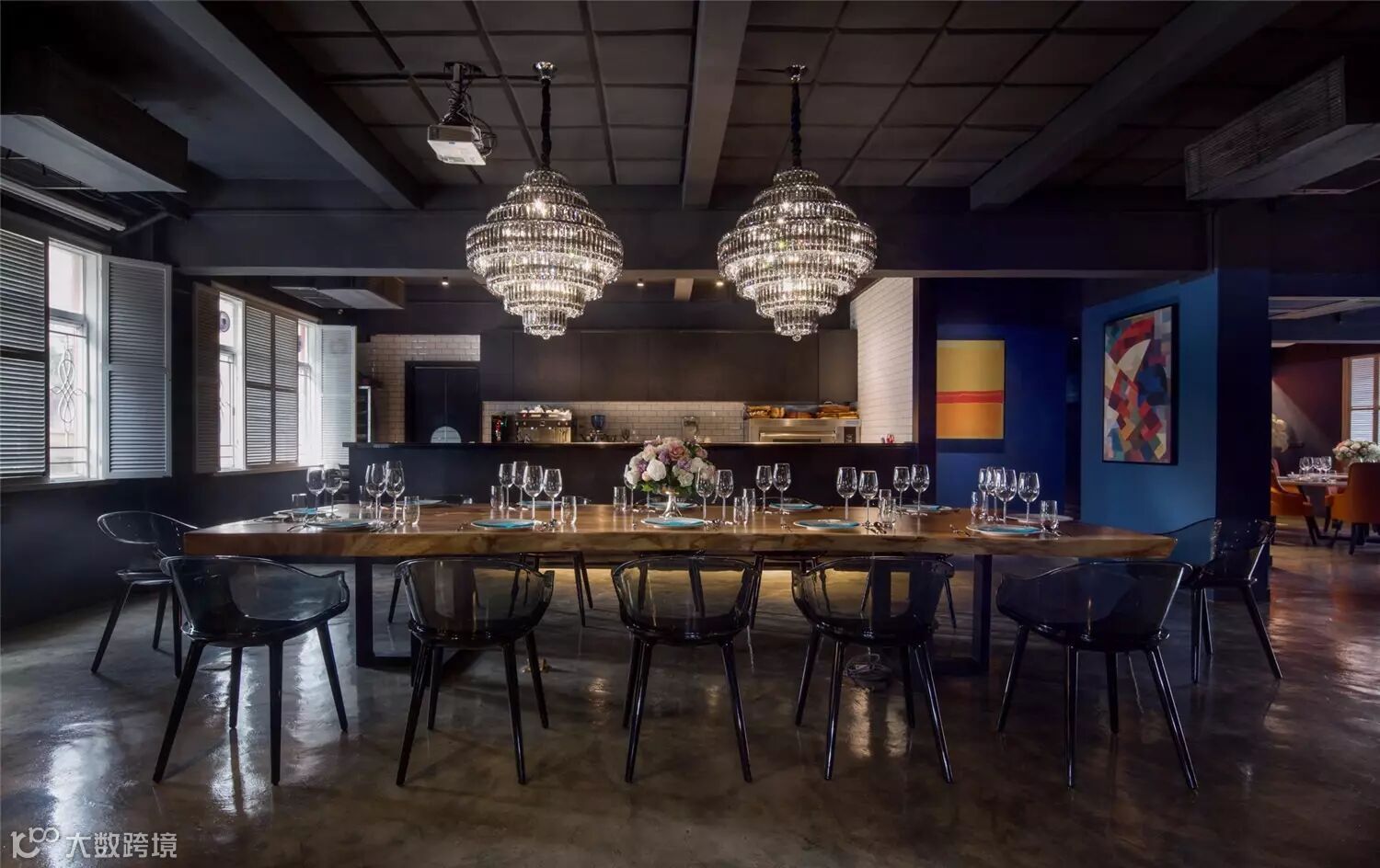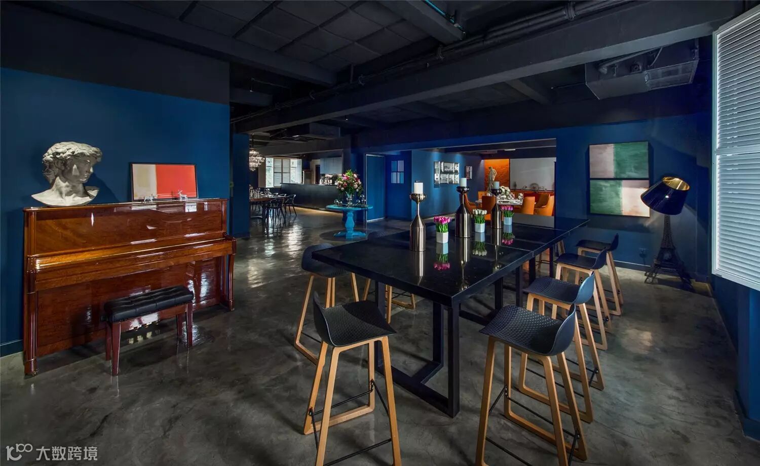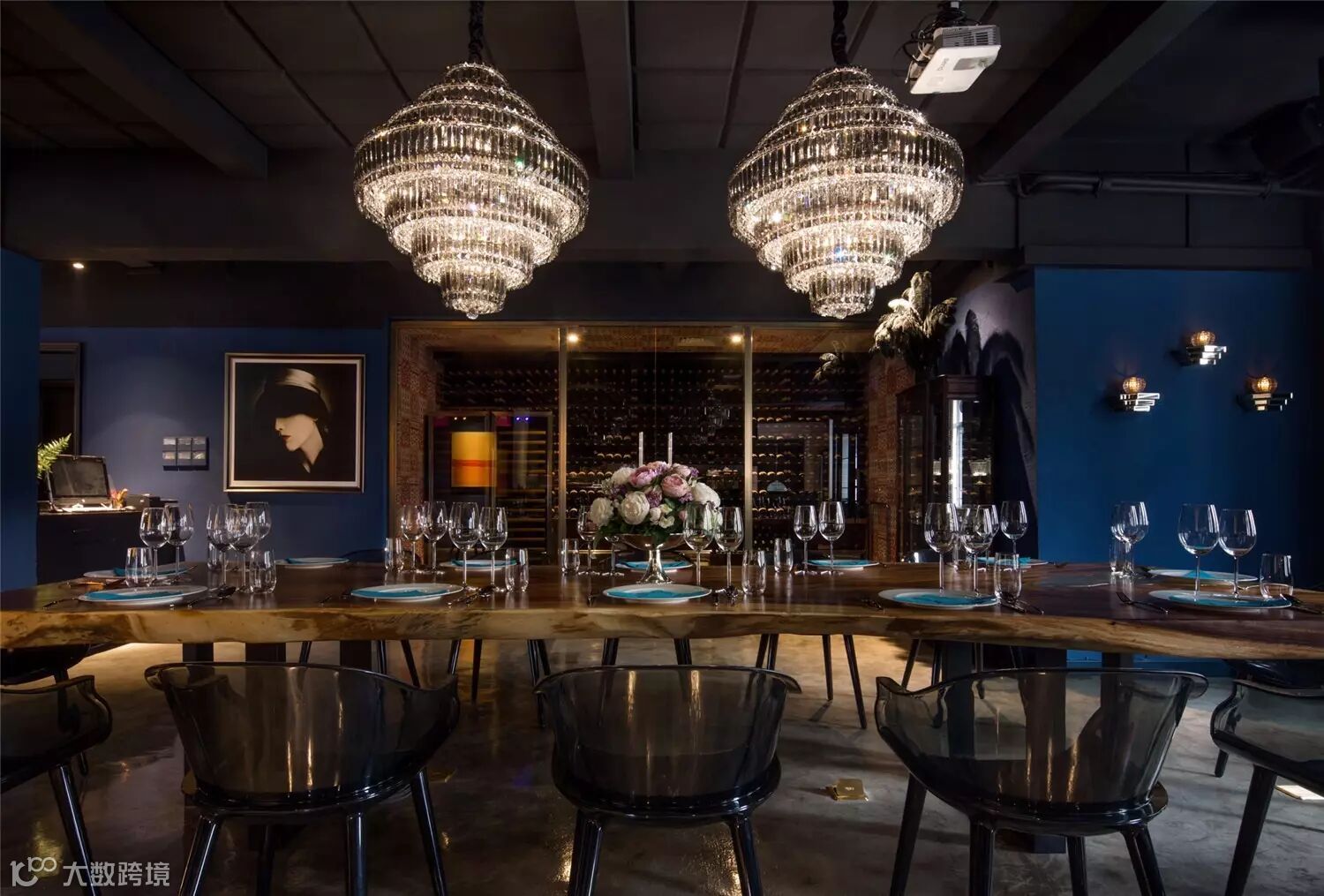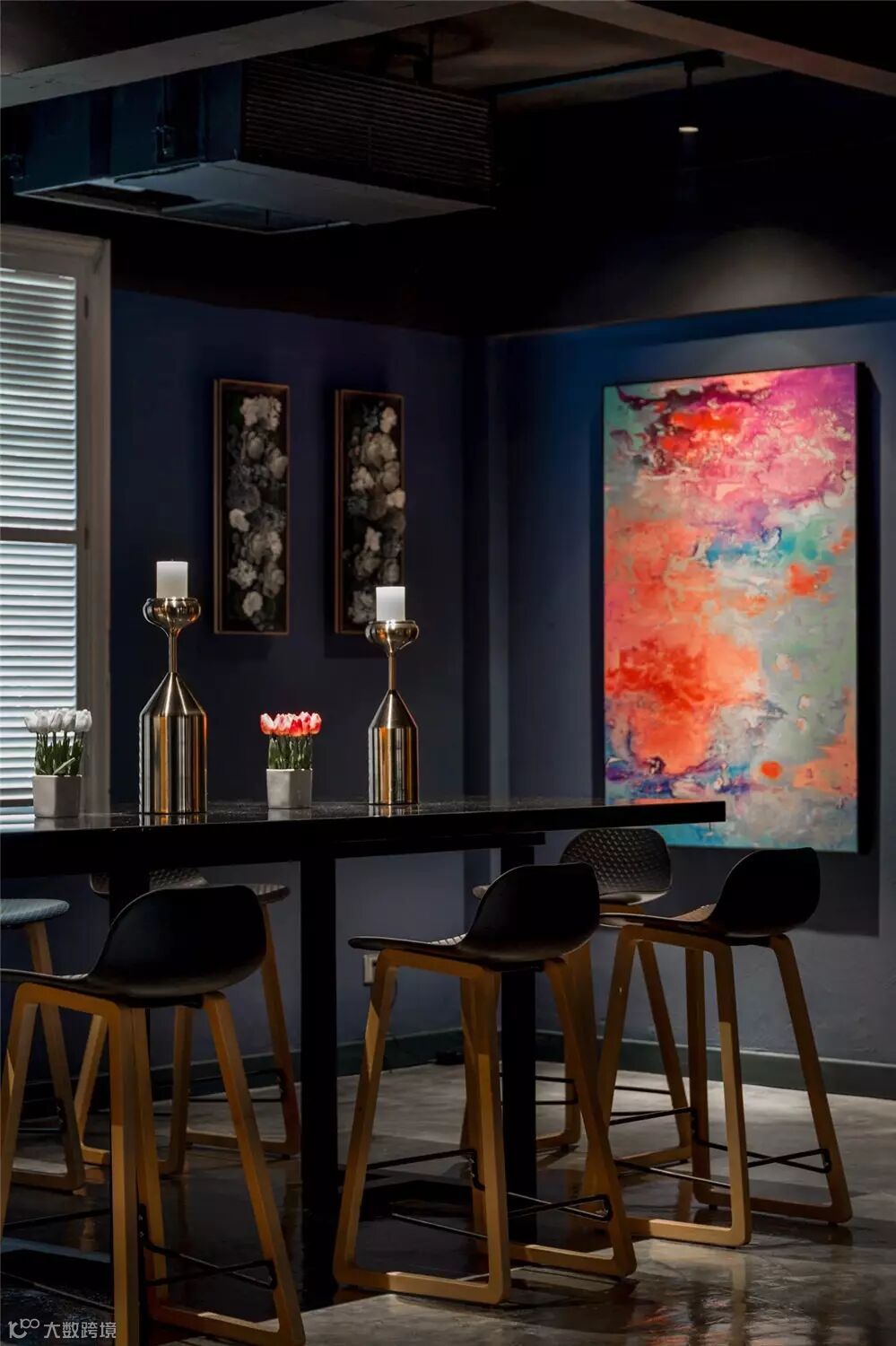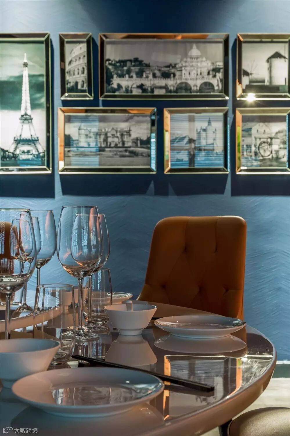 byal以现代巴黎为设计主题,色彩、材料和装饰都无不彰显着隐秘与欢迎的氛围。室内空间以沉稳的绅士蓝为主色调,同时以色彩浓郁饱满的挂画作为空间的点缀,使视觉感官达到平衡。按功能划分,会所分为餐厅、酒窖、吧台、后厨及VIP室等区域。