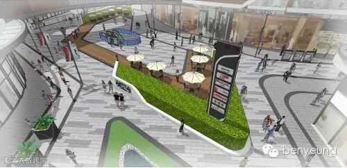 商业中心以按花园式、生态式庭院景观设计方案进行建设。整体设计以生态绿化轴, 共享园林为主体, 并通过其他道路绿化,将各建筑组织群的庭院的绿化连为一体,打造独特的绿化空间和舒适宜人的购物环境。