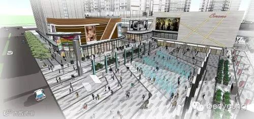 东南西出入口均采用轴线布局的形式,轴线交汇处规划为国际餐饮连锁店和电影院,充分体现“通而不透,畅而不直”的设计原则。电影院与各主入口之间形成了对景,并将南北商业物业分成了两部分,北边主要为大型商业综合体及与小型综合体的组合,南边为商业街区。在电影院与北入口广场之间,规划一个宽阔的商业广场,为商业活动及市民休闲提供了良好的场所,还进一步提升该区商圈的辐射力。