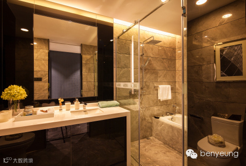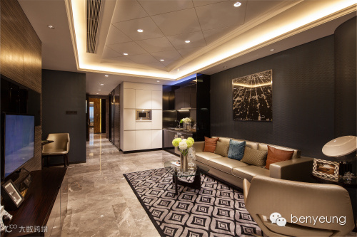E户型以深色为主调,营造舒适时尚的居住空间。大量运用镜面元素是此户型的特色之一,借助镜子与灯光的互动效果,扩大空间感,使整体设计看起来更丰富。几何元素是一个设计亮点。从天花到墙面装饰,再到花纹地毯,几何元素的运用与巧妙组合赋予空间细腻而富有张力的美感。