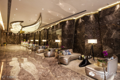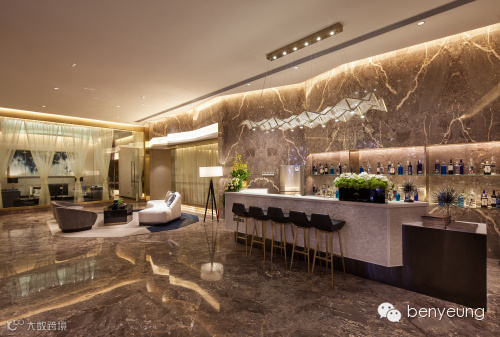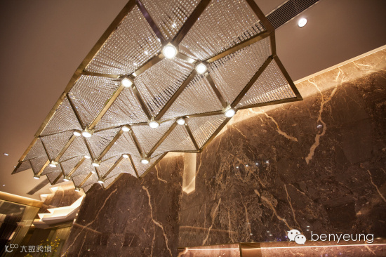 灯饰是整个设计的亮点,其灵感来源于海德公园,着重质感的表现,以钻石及花瓣元素增加空间趣味。如盛放花卉般的大型灯饰是空间首层向二层的延伸,并起到了过渡作用。二层会客区吧台上方的吊灯以钻石切割元素彰显低调奢华之感。