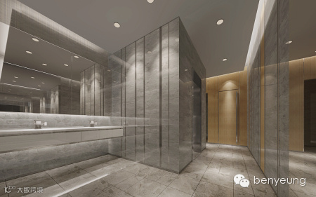 深色的大理石肌理与淡金色的夹丝玻璃是走廊与电梯厅的延伸,也是走廊、电梯间与卫生间的过渡,使不同的空间有浑然一体之感。通透的镜面元素、柔和的木纹与线条利落的隔间展现了空间的时尚、自然、纯净,给人以洁净舒适的感觉。
