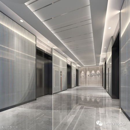 标准层电梯厅以夹丝玻璃装饰墙面,极富韵律感。灰白的顶面,淡褐的地花,柔和的灯光,给人以素雅静逸的感观享受。装饰墙上的鱼形装饰加深了建筑与海洋的联系。走廊的设计以简约为主,以含蓄的颜色、简约的软饰达到以简胜繁的效果,务求用简洁的表达形式来满足人们对空间环境的理性需求。