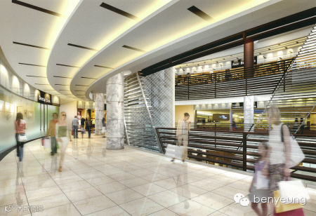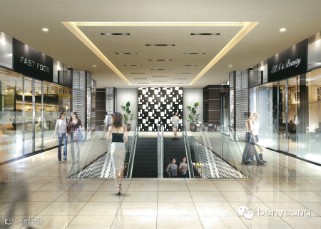 店铺门头皆为黑色不锈钢,突显现代简约之感,诠释了本案设计主旨。镜面不锈钢贯穿整个空间,形成迂回曲折、变化繁复的过渡空间,赋予整个商场流动感及丰富的空间层次感,并带来强烈的视觉冲击感。层次鲜明的造型天花起到了点睛作用。