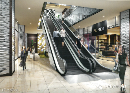 中庭方正的全透明观光电梯仿佛倾斜而下的瀑布,而黑色的地花则是飞溅的水沫,结合两侧的竹子,让人犹如身处苏州古典园林。白色的柱体配以上流淌的黑色纹路,仿佛极具韵味的水墨画。