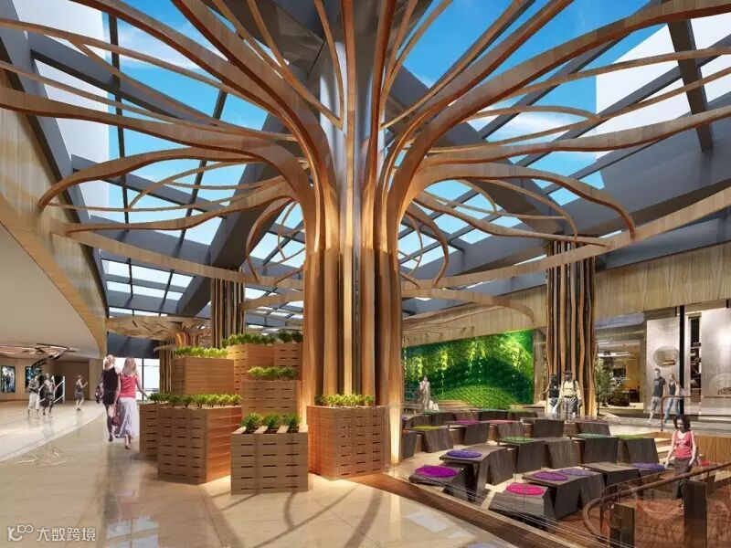 随处可见的装饰树与树叶元素象征与南粤文化密不可分的榕树。榕树苍劲挺拔,生命力顽强,自然在南国人民心中生成一种特有的“榕树文化”,本案以榕树为设计主线,不仅把小区、本土艺术、文化元素融于设计之中,让消费者产生亲切感,还将艺术赏析、人文体验与自然环保三者完美结合,缔造独特而充满革新的多元文化商业空间。