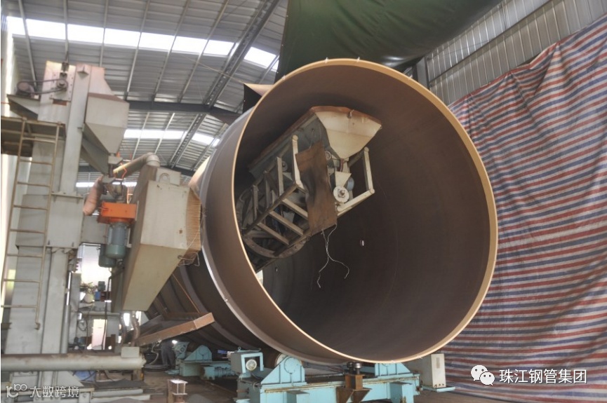 目前国内常规FBE防腐都是外壁喷涂,此次大口径内壁喷涂为国内首创,由于管体外部有加强肋板结构,外壁通过时中频线圈加热无法实现。珠江钢管珠海公司通过技术研发采用机械臂配合内壁加热线圈、前端喷涂装置一体的自动化系统,实现管体内部加热和喷涂的同步进行,实现内壁作业的平顺和高效。此装置能够实现不同管径和长度钢管的内壁防腐,调节方便快捷。此系统填补国内大口径钢管内壁FBE防腐的空白,让大口径输水钢管的防腐效果和使用年限大大增强。