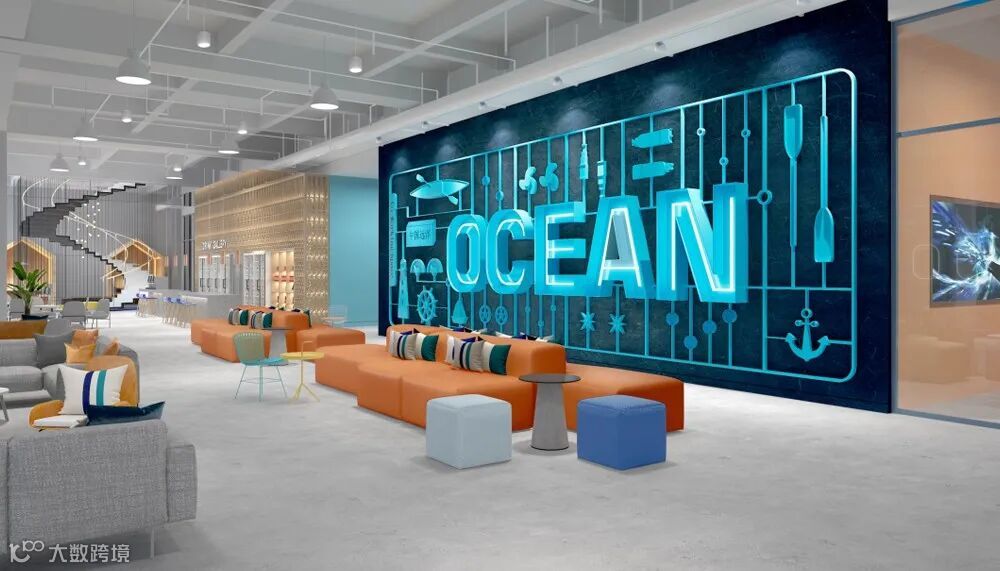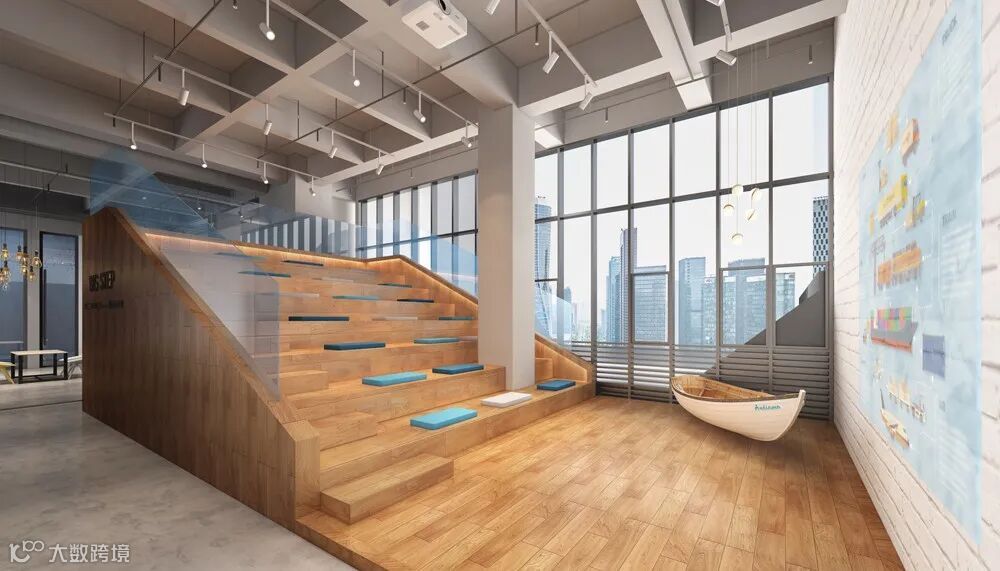 室內設計以航海及運輸作為主題,靈感源於項目所在地廣西南寧,這裡是“陸海新通道”通達世界的重要連接點,利用海洋、航海路線、船、集裝箱等設計元素貫穿整個空間,彰顯北部灣港集團的業務特色,打破傳統古板、條條框框的辦公模式,營造創意藝術社區式辦公環境。