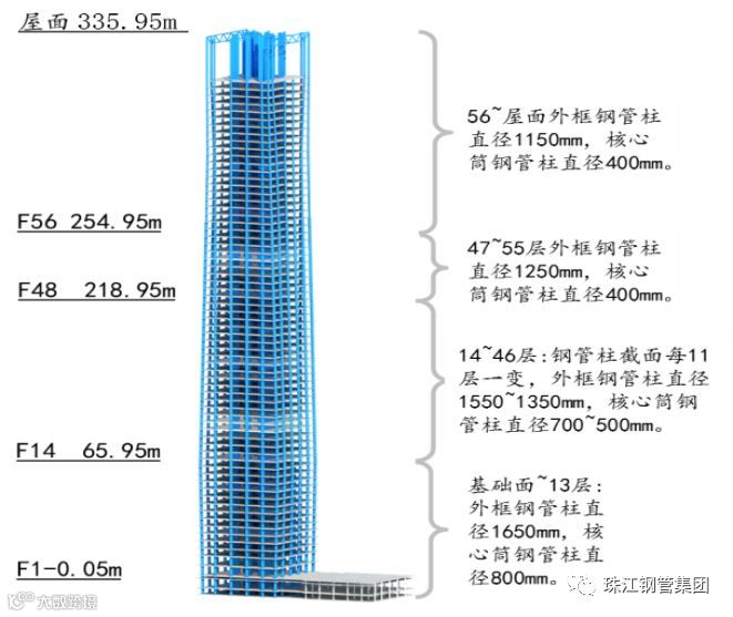 据悉,悦泰·珠西商务中心位于江门市新会区,总建筑面积约47.659万㎡,项目建筑分为地下3层,地上71层,建筑高度335.95m,是目前粤西地区建筑高度最高、商业影响力最大的区域商业综合体钢结构超高层地标建筑。该工程主体钢结构用量约2万吨,钢管柱、连接钢板材料均为Q420。珠江钢管珠海公司以过硬的技术实力、领先的生产条件,最终中标承接了该项目钢结构其中最重要环节,超高层主体钢结构的建造任务。