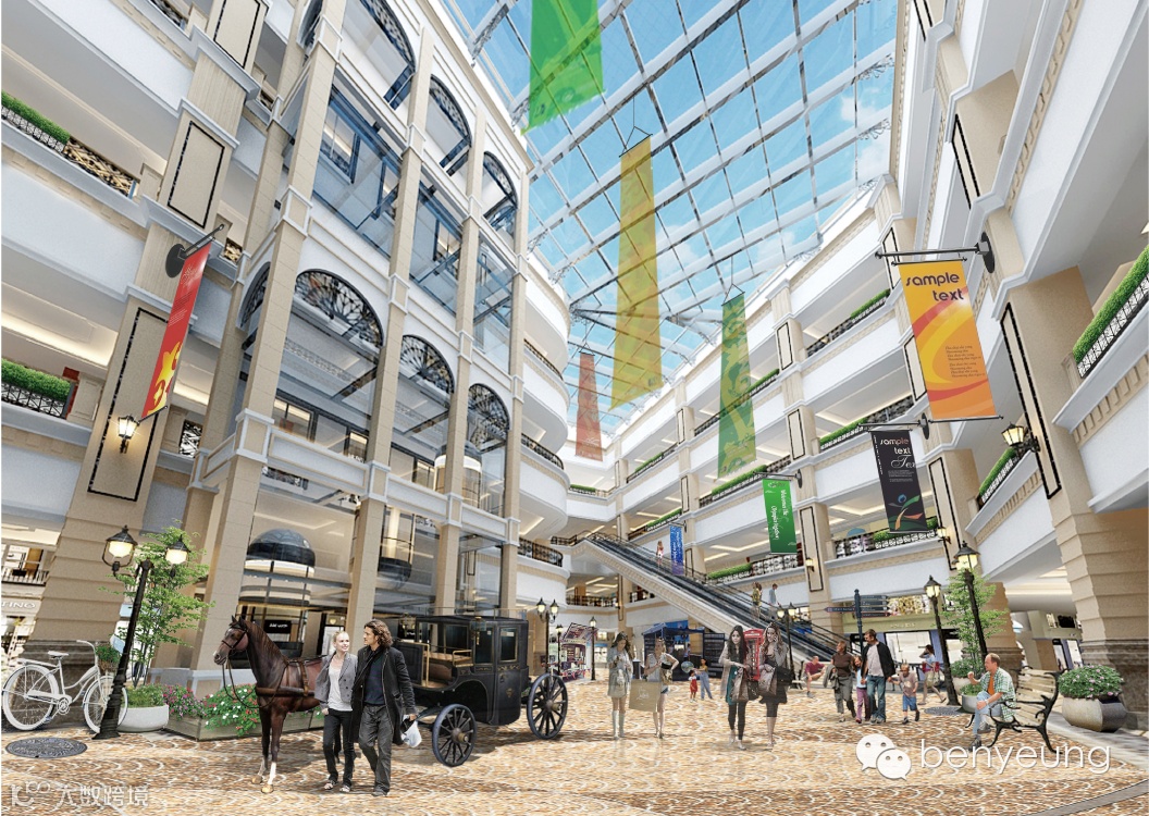 中庭以简洁大方的白色为主色调,通过细节的丰富变化,让整个空间成为通透舒适的浅色调空间。顶端为玻璃天花,采用井字梁支撑结构,固定大面积的玻璃面,既环保又有利于节省能源。典雅繁复的褐色地花与空间的主色调——白色形成鲜明对比,却又在色彩感觉上配合得相得益彰。镂花铁艺、仿真马车摆设让人仿佛回到了文艺复兴时代。