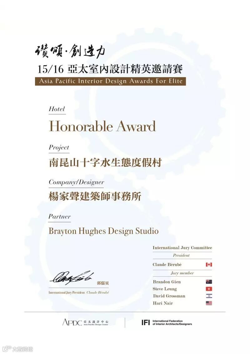 因其出色的设计,南昆山十字水生态度假村得到了多项国际设计赛事评委会的青睐和肯定,所获奖项硕果累累。