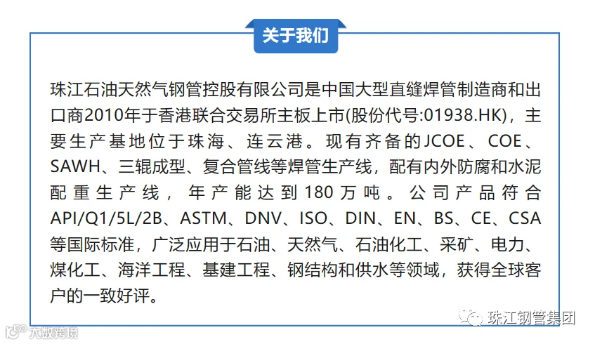 以港珠澳大桥项目为基础,珠江石油天然气钢管控股有限公司在海洋工程装备领域迅速崛起,形成深水油气输送用管、海洋平台用管、海上风电用管、海洋基建工程用管等较完整的海工配套产品,成为市场瞩目的新亮点。