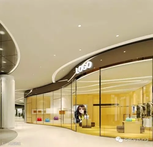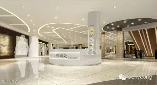 咨询处及商铺以米色、褐色为基调,配以金属及玻璃等高反射材质的铺设,营造一种时尚、前卫的商业氛围。铺内的陈设以现代简约为主,迎合商场的目标客群——年轻一族的审美与追求,从而达到吸引客源的目的。天花的灯带为整个空间增添动感,并烘托、渲染商场气氛,对展现商场的特色风格起到重要作用。