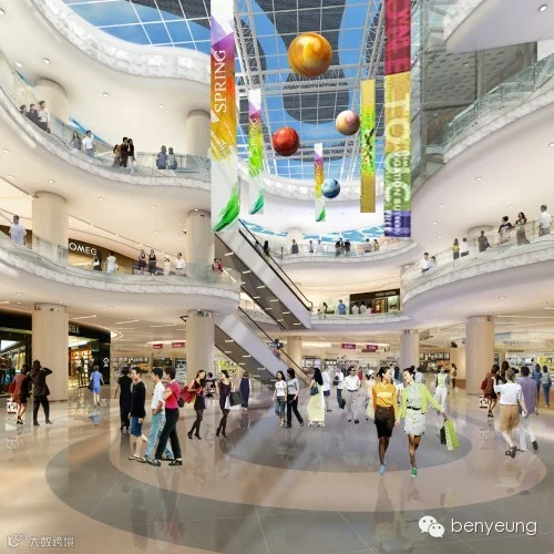 B1、B2层为国际时尚MINI精品城,整体为时尚现代设计风格,并融合不同国家的文化元素,构建别具一格的商业空间。除了异国风情元素,色彩的大胆运用也是本案的设计亮点之一。活泼的黄,沉静的蓝,鲜艳的红等在一般商业空间不常见的颜色都会在这里出现,在视觉上形成强烈的跳跃感与转折感,给人耳目一新之感。