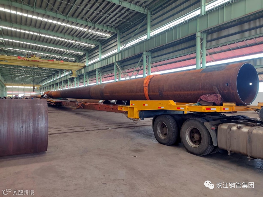 近日,珠江钢管连云港公司的“菲律宾海上导管架项目”45米超长桩管顺利开始交付。