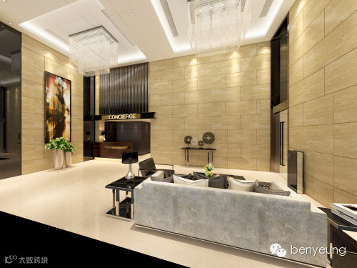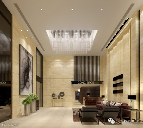 电梯厅也采用了现代简约的设计手法。墙面与地面大面积采用米色大理石,给人以高贵典雅之感,还体现了悦府低调奢华的形象。再配以黑镜钢,增强整个空间的纵深,同时与天花的几何图案遥相呼应,简洁而明快。