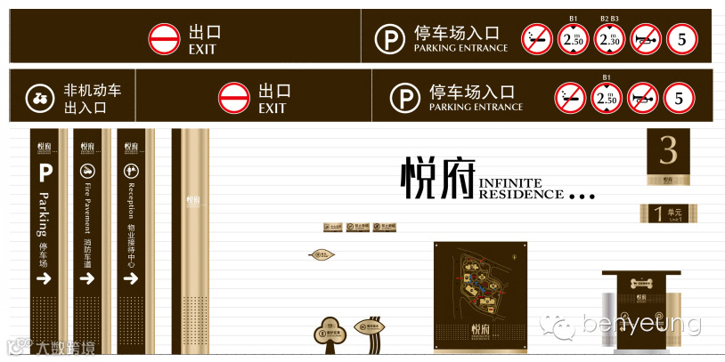 作为高端住宅,奢华、沉稳是本案形象不可缺少的元素,故本案的导视系统设计以深褐、金色为基调,结合无指纹镜面不锈钢,充分体现悦府的形象,并寓意住户在悦府的至尊享受,为悦府形象的推广和树立奠定深厚基础。