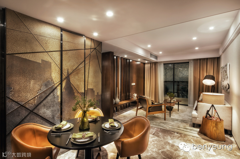 室内设计以流动的线条、图案、光等元素活化空间。踏出西村站地铁C出口,穿过私家入户绿道,便来到位于建筑最安静一端的公寓入口。入口通过立体式的绿化景观围墙与叠水景观,打造别树一格的优雅感。大堂与电梯厅的简约时尚设计,结合流淌的线条、精致的吊灯及配饰,让整个动线活化。乘坐电梯至五楼,特设的空中平台花园以移步换景的园林设计手法,结合独特艺术摆饰和带氧植物,营造新加坡风情休闲空间,让住户充满视觉享受,同时赋予整栋建筑生机与动感。