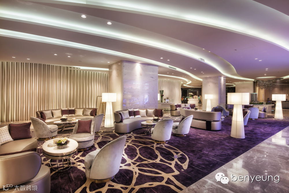 销售中心外立面为通透玻璃材质,丰富了室内空间层次,并提高展厅整体亮度,使整个空间舒适柔和,从而达到吸引顾客的目的。室内设计风格为现代简约,以高雅的白色为基调,流线型的水晶吊灯增加空间的动感,淡紫色的射灯、地毯与建筑的主色调互相呼应,增强整体感的同时提升了空间的格调。