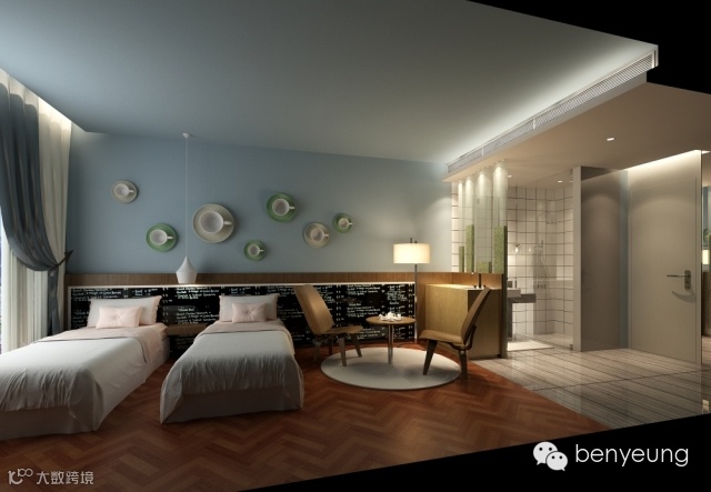 与时尚而不失灵动的单人房不同,双人房的设计风格较为成熟沉稳。柔和的粉蓝色从天花流淌至墙身,搭配线条简洁利落的家具和棕色条纹木地板,使整个空间犹如平静的海洋般安闲舒适。墙身上的装饰的灵感来源于装置艺术,以艺术的手法将大小不一的咖啡杯错落有致地放置在墙身上,突破人们惯有的思维框架并带来强烈的视觉冲击,从而给顾客留下深刻印象。