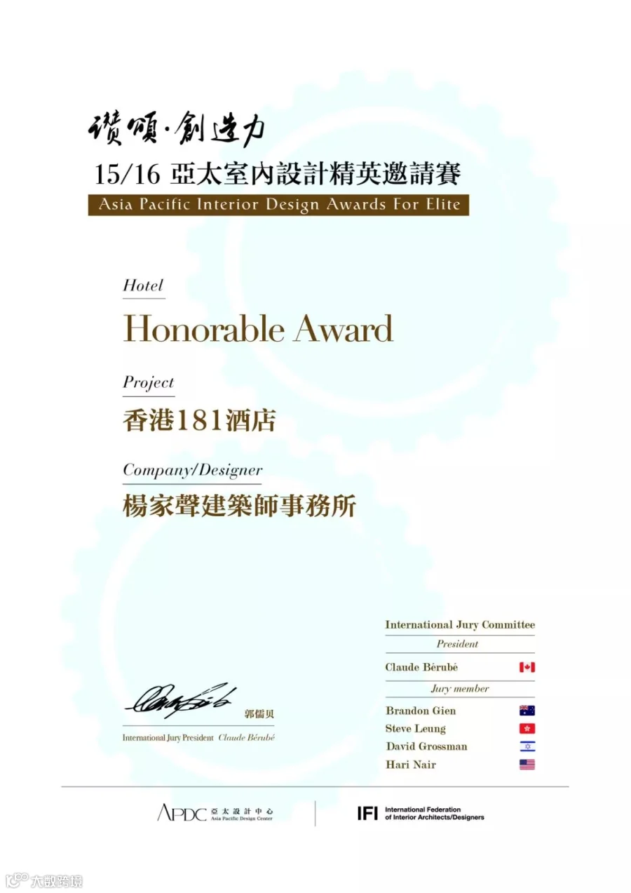 凭借卓越的设计品质,One-Eight-One Hotel & Serviced Residences项目获得多个国内及国际赛事的认可,曾荣获中国(上海)国际室内设计节暨第十二届“金外滩”奖-最佳概念设计奖,亚太室内设计精英邀请赛-酒店空间佳作奖等等。