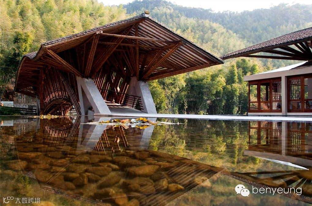 度假酒店的一期规划结合了中国客家夯土墙和竹子建筑工艺,将建筑语言融入文化,风格紧贴自然,体现出人文与自然的充分和谐。在二期规划中,我们沿用了一期的元素,突破屋顶构建技术,仿照山体的起伏曲线,通过实体模型对其进行拟建和验证。立面设计采用环保的绿化墙和竹百叶。