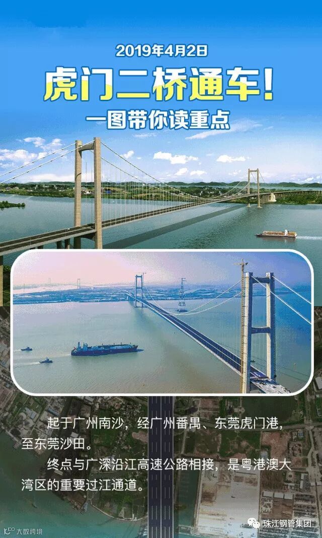 2019年4月2日,“超级工程”南沙大桥(虎门二桥项目)正式通车,粤港澳大湾区互联互通再添新动脉。珠江钢管集团为这“中国第一跨桥梁”“世界第一跨的钢箱梁悬索桥”南沙大桥制造打桩管(桩基钢护筒工程钢管)。