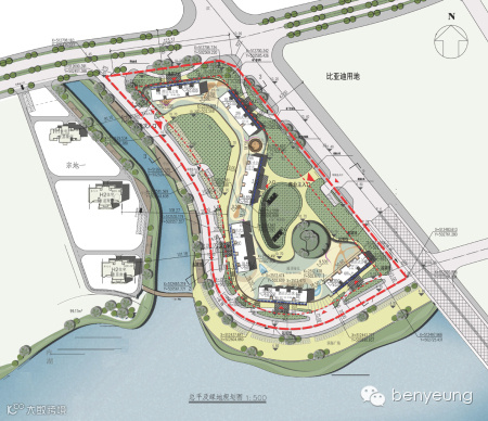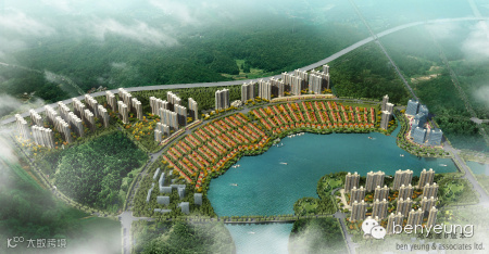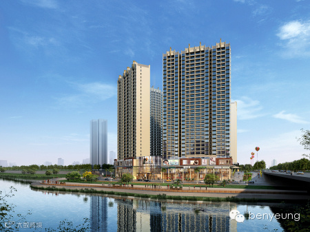 惠州大亚湾滨海城地处惠州市中兴二路和环湖西路交界口,总用地39399平方米,拟建5幢酒店式公寓和1幢酒店,大体沿北向36度轴线作S形布局。1-4幢公寓楼高32层,建筑高度为96.65 米,首二层为裙楼,三楼为架空层;第5幢公寓与酒店楼高30层,建筑高度为97.30 米,一到三层为裙楼;最南面的两栋建筑面朝哑铃湾,坐拥一线景观资源。